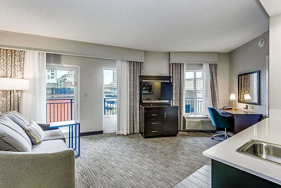 Balcony, 32-inch LCD HD TV, work desk, sofa bed, coffeemaker, free WiFi, refrigerator, microwave Relax in this studio suite featuring two clean and fresh Hampton beds® and a large balcony. Enjoy a movie on the 32-inch LCD TV with HD channels and sleep additional guests on the sofa bed included in this studio. This suite offers a convenient work space with a desk and free WiFi. Refresh in the bathroom with fluffy towels and a shower featuring a curved shower rod for added space and light. Additional amenities include a coffeemaker, a microwave and a refrigerator. Balcony views are of the parking lot or Conti Street.