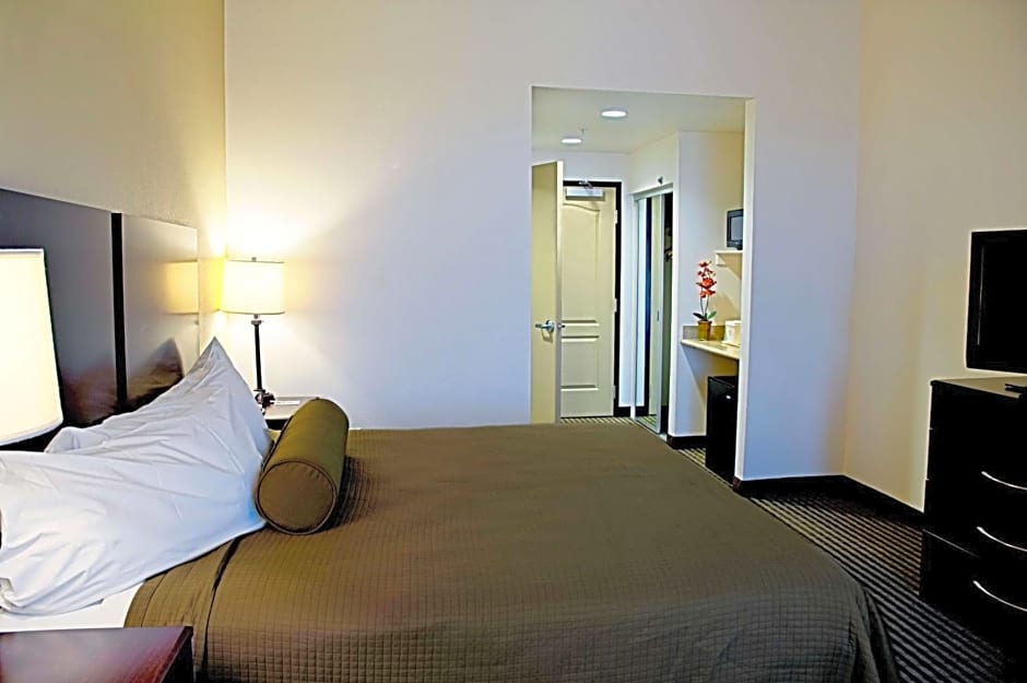 The Legacy Inn & Suites offers a Queen Room with Two Queen Beds and a King Room. The Queen room is non-smoking and accommodates 4 adults and 3 children, with 2 Queen size beds and a room size of 301 sqft. The King room is also non-smoking and accommodates 2 adults and 1 child, with 1 King size bed and a room size of 301 sqft.
