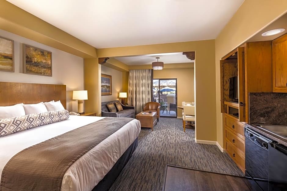 Beyond the greens, the retreat invites guests to cool off in an outdoor pool or unwind in a spa tub. A tennis court stays active, and a free fitness center keeps workouts on track, while private entrances and balconies give a sense of personal space.