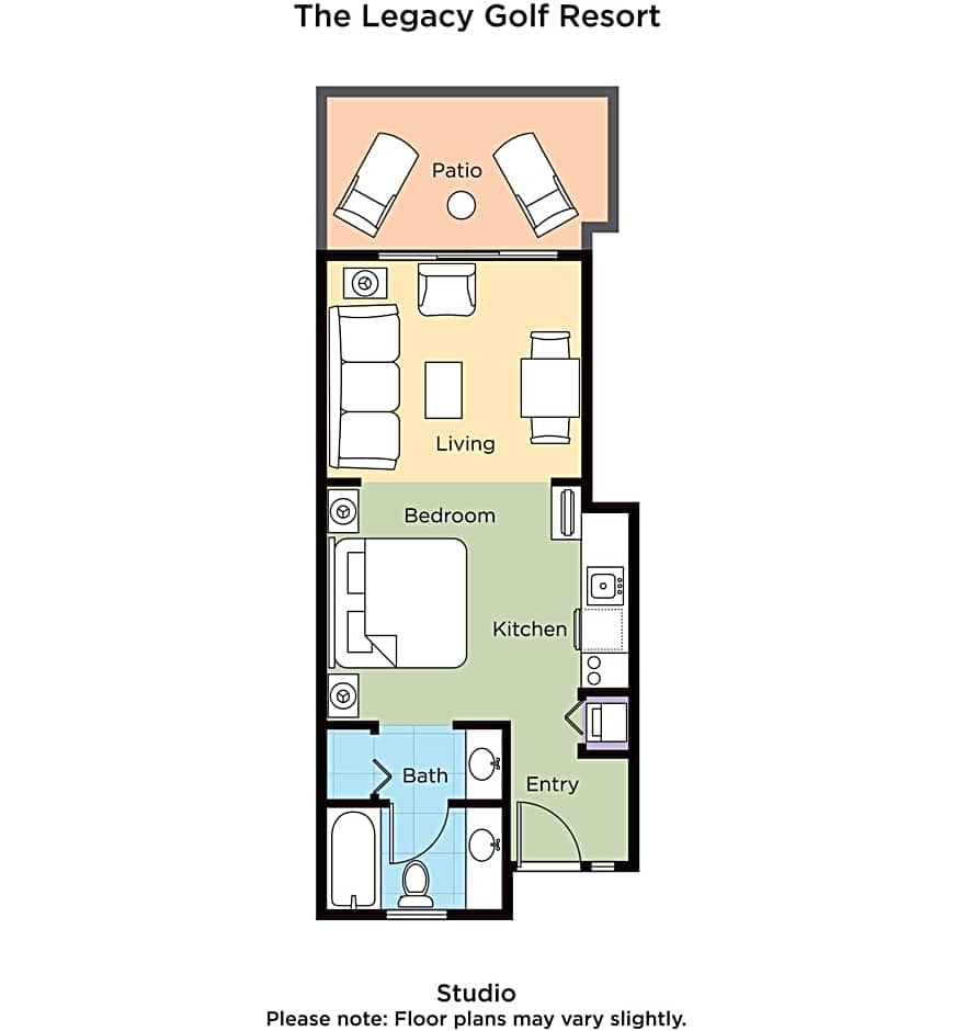 The Legacy Golf Resort offers two types of rooms: One-Bedroom Suites with Sofa Bed and King Studios. The One-Bedroom Suites have a size of 829 sqft and accommodate 4 adults and 3 children. Smoking is not allowed in these rooms, and they have a sofa bed and a king size bed. The King Studios are smaller, with a size of 420 sqft, and also accommodate 4 adults and 3 children. Smoking is not allowed, and they have a king size bed and a sofa bed.
