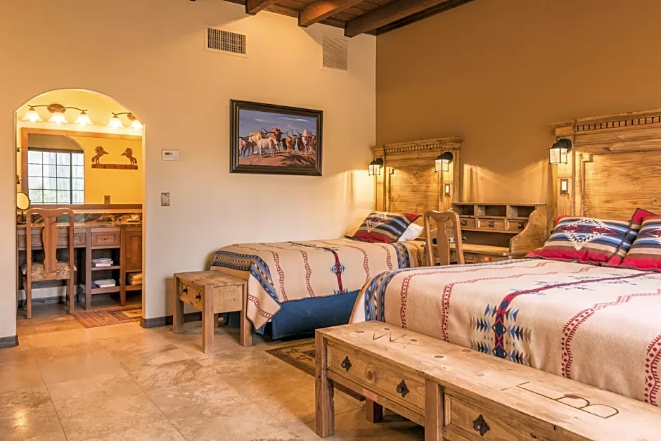 Perfectly placed for views of our spectacular Arizona sunsets and recently renovated, these rooms are beautifully appointed with tile floors, solid wood furniture and granite vanities. Our standard double room offers one Queen bed and one Twin bed and a spacious bathroom with separate vanity area. You’ll be right next to the horses and conveniently located near our main lodge and dining room. This guest room is 303 square feet.