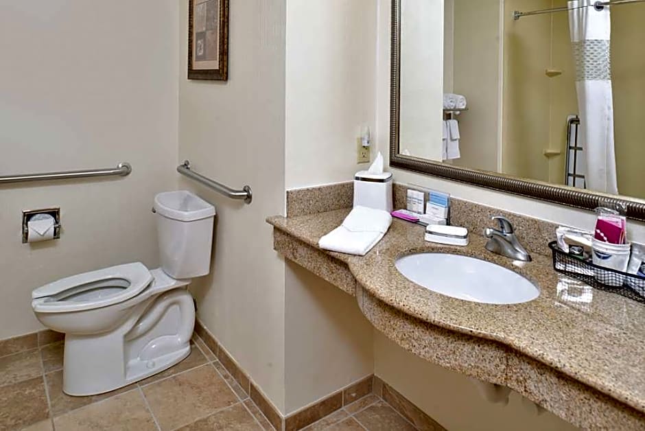 Any corresponding photo may not reflect the specific accessible room type or room feature. This mobility and hearing accessible, nonsmoking room features one king sized bed , and an accessible roll-in shower. The room also has a visual alarm and notification devices for the doorbell or door knock and incoming phone calls. The room features comfortable soft seating, microwave, refrigerator, a HDTV, and easy to operate alarm clock/radio. The free high speed internet access will help you stay connected while on the road. If you prefer not to work at the desk, you can use the convenient lapdesk instead. You'll also enjoy the convenience of having a coffee maker with tea service and iron/ironing board in your room.