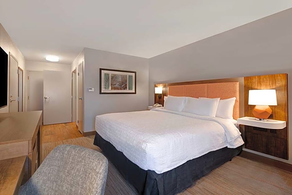 This mobility and hearing accessible, non-smoking room features one king-sized bed, and an accessible bath tub. The room also has a visual alarm and notification devices for the doorbell or door knock and incoming phone calls. This room includes a microwave, mini-refrigerator, a 32-inch LCD HDTV, and easy to operate alarm clock/radio. The free high-speed internet access will help you stay connected while on the road. If you prefer not to work at the desk, you can use the convenient lapdesk instead. You'll also enjoy the convenience of having a coffeemaker with tea service and iron/ironing board in your room. Any corresponding photo may not reflect the specific accessible room type or room feature.