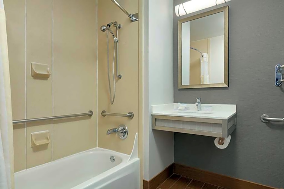 This mobility accessible standard room features one king-sized bed, and an accessible tub. This room offers the latest in technology and ergonomic comfort to our guests. Grab bar in tub with attached accessible seating, lowered vanity in bathroom, and lowered shelf in closet. The ergonomic Mirra chair by Herman Miller is good for your back and better for work. Enjoy an in-room movie or your favorite television show on our 36-inch HDTV. There is also a microwave, refrigerator and coffee/tea maker to help you feel at home. And for conducting business, our rooms ensure your productivity with spacious work desk, two telephones and WiFi. Any corresponding photo may not reflect the specific accessible room type or room feature.