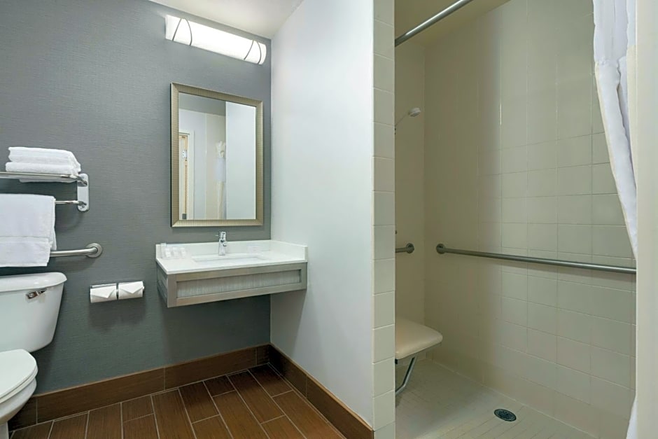 This mobility accessible standard room features one king-sized bed, and a roll-in shower. This room offers the latest in technology and ergonomic comfort to our guests. Roll-in shower with attached accessible seating, lowered vanity in bathroom, and lowered shelf in closet. The ergonomic Mirra chair by Herman Miller is good for your back and better for work. Enjoy an in-room movie or your favorite television show on our 36-inch HDTV. There is also a microwave, refrigerator and coffee/tea maker to help you feel at home. And for conducting business, our rooms ensure your productivity with spacious work desk, two telephones with dataport and voice mail and complimentary WiFi access. Any corresponding photo may not reflect the specific accessible room type or room feature.