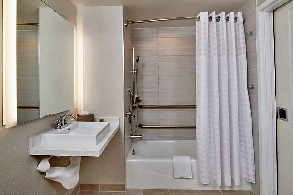 This mobility accessible standard room features one king-sized bed, and an accessible tub. Our guestrooms feature the comfort of the Sweet Dreams by DoubleTree plush top king-sized bed. A triple sheeted down blanket and cozy coverlet give you an "at home" feel. Lie back on the 3 down pillows and 2 foam pillows or relax on the comfortable sofa with a sofa bed for those last minute guests, while flipping through the over 90 channels with more than 20 of which are now HD. If you must work, do so at the large desk while sitting on the comfy desk chair while you access the internet via a high-speed connection with an easy to reach desktop outlet. The bathroom has enough vanity space to spread out to be able to make yourself right at home. The bathroom has a shower/tub combination with the popular curved shower rod. Any corresponding photo may not reflect the specific accessible room type or room feature.