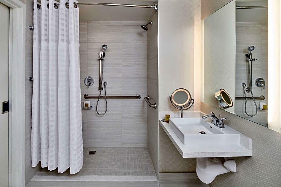 This mobility accessible standard room features one king-sized bed, and a roll-in shower. The Sweet Dreams by DoubleTree plush top king-sized bed is the centerpiece of this well-appointed non-smoking room. A triple sheeted down blanket and cozy coverlet give you an "at home" feel. Lie back on the 3 down pillows and 2 foam pillows or relax on the comfortable sofa with a sofa bed for those last minute guests, while flipping through the over 90 channels. If you must work, do so at the large desk while sitting on the comfy desk chair while you access the internet via a high-speed connection with an easy to reach desktop outlet. The bathroom has enough vanity space to spread out to be able to make yourself right at home. The bathroom has a shower/tub combination with the popular curved shower rod. Any corresponding photo may not reflect the specific accessible room type or room feature.