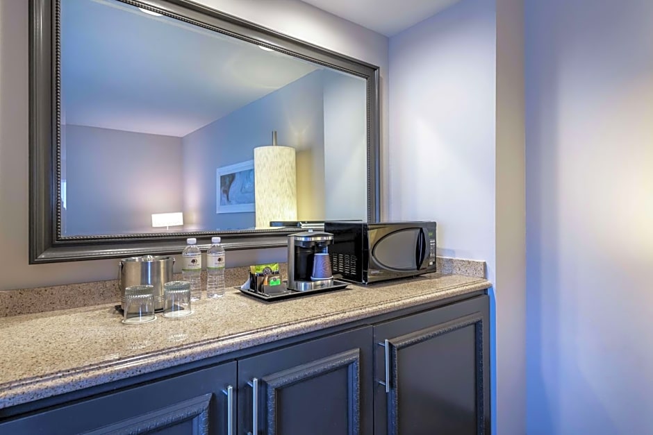 This mobility accessible, non-smoking junior suite features one king-sized bed with DoubleTree Sweet Dreams bedding and a sofa bed. The bath is equipped with accessible roll-in shower. Any corresponding photo may not reflect the specific accessible room type or room feature.