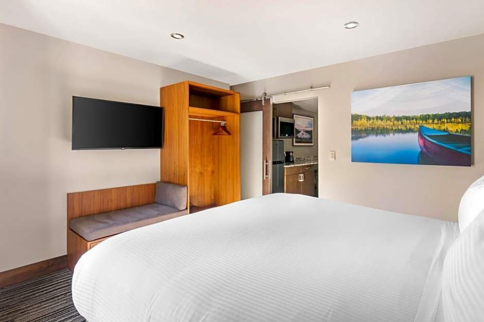 Room configurations cater to flexible stays. Options include suites with two king beds and a sofa bed across two bedrooms, as well as suites with two queen beds and a sofa bed, some featuring kitchenettes and fireplaces. Larger layouts reach about 1,001 square feet, offering plenty of space to spread out for families or groups.