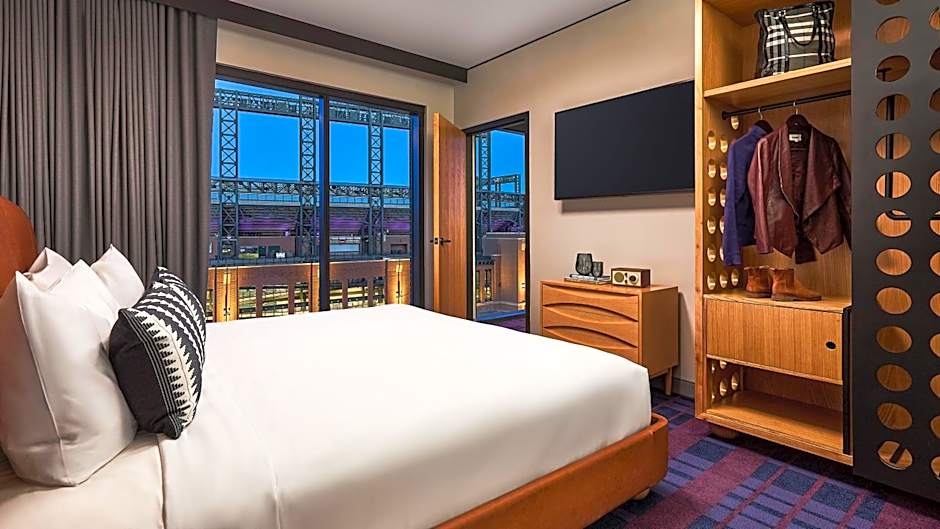 Located exactly 5,280 feet above sea level, our Mile High King Corner Suite was designed to deliver an unparalleled, stand-out experience at The Rally, with a luxurious master bedroom overlooking Coors Field, a separate living area, and a corner nook with stacked bunk beds towering The Plaza. Drawing inspiration from the natural colors of a sunset over The Rockies and Coors Field, these premium rooms offer dark design accents of purple, black, and a misty, Colorado orange. Upgraded, luxurious amenities include rich leather, a full wet bar with top-shelf beverage options, a full bath, Keurig™ coffee, a book bundle curated by Denver's own, Tattered Cover Book Store, and a smart thermostat for optimum convenience. The large bathroom is outfitted with a double vanity, Beekman 1802™ bath products, and a luxurious rain showerhead. Bring out your darker side in The Mile High.