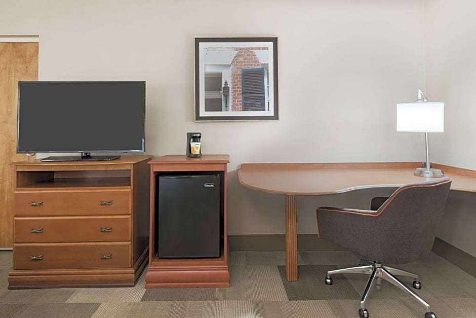 This hearing accessible, non-smoking room features one king-sized bed. The room also has a visual alarm and notification devices for the doorbell or door knock and incoming phone calls. The room features comfortable soft seating, a 32-inch flat-screen HDTV, and easy to operate alarm clock/radio. In the bath you will enjoy a WaterPik showerhead and curved shower rod. The free high-speed internet access will help you stay connected while on the road. If you prefer not to work at the desk, you can use the convenient lapdesk instead. You'll also enjoy the convenience of having a coffeemaker and iron/ironing board in your room. Any corresponding photo may not reflect the specific accessible room type or room feature.