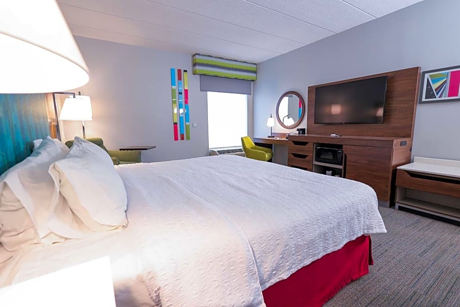 Free WiFi access, whirlpool tub, HDTV, easy chair & ottoman, work desk, coffeemaker Enjoy your stay in this spacious non-smoking room which features one king-sized clean and fresh Hampton bed® and a relaxing whirlpool tub. Unwind in the easy chair and watch a movie on the 25-inch HDTV or work at the large desk and stay connected with free WiFi access. Savor a freshly brewed coffee from the coffeemaker provided. The bathroom offers plush towels and a shower with a Waterpik® showerhead and curved shower rod which allows more light and space in the shower.