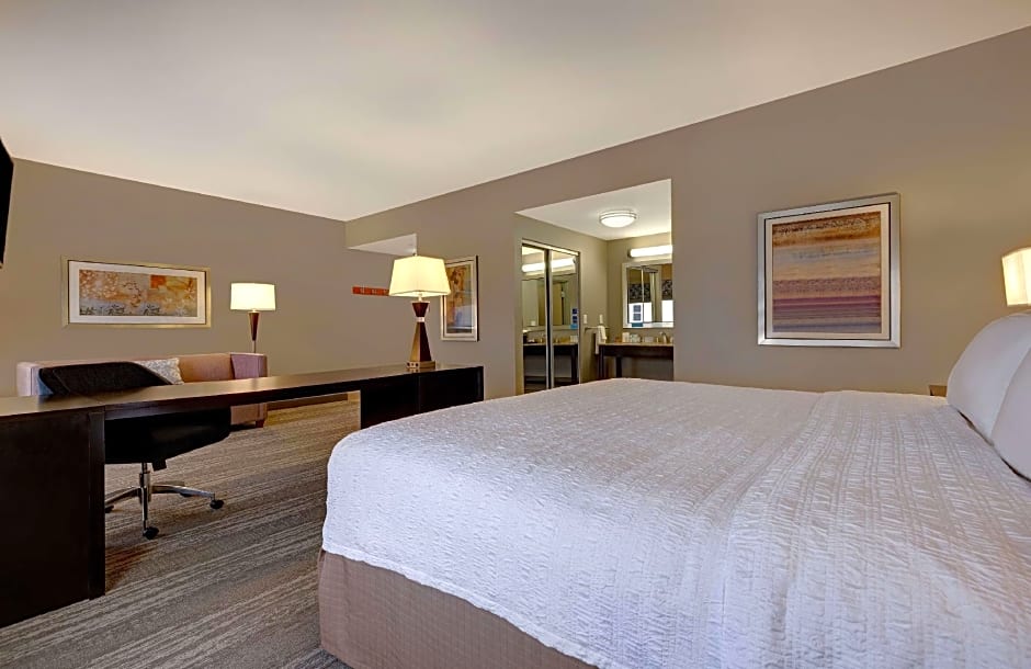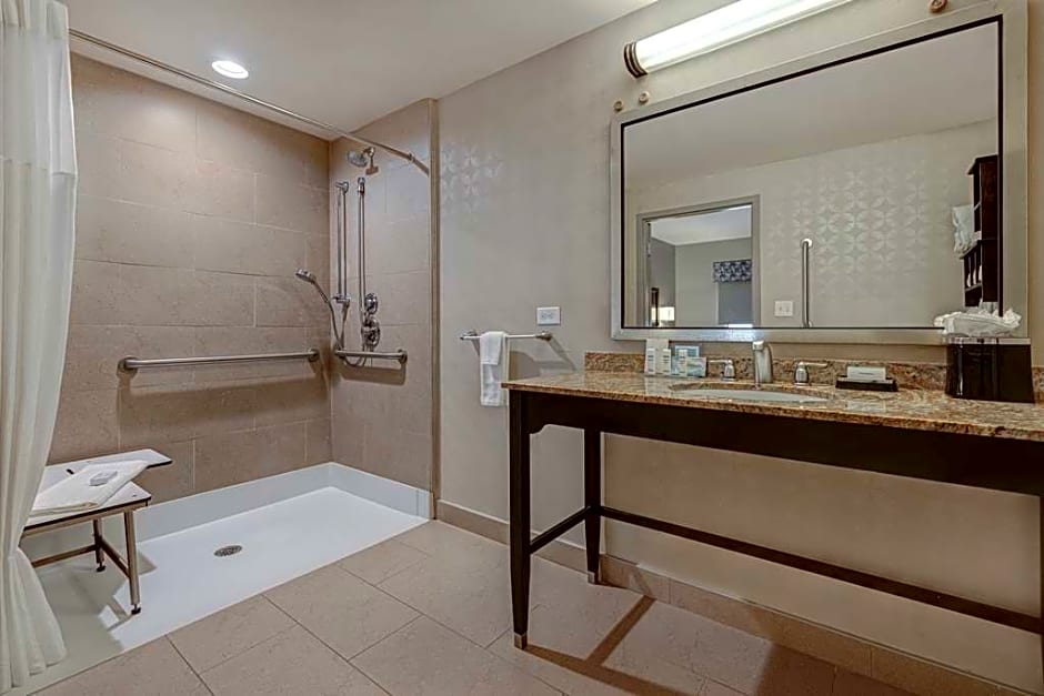 Any corresponding photo may not reflect the specific accessible room type or room feature. This mobility and hearing accessible one-room, nonsmoking studio suite features one king sized clean and fresh Hampton bed and an accessible roll-in shower. The suite also has a visual alarm and notification devices for the doorbell or door knock and incoming phone calls. The room features include a microwave, refrigerator, wet bar, comfortable soft seating, 39-inch HDTV and easy to operate alarm clock/radio. The free high-speed internet access will help you stay connected while on the road. If you prefer not to work at the desk, you can use the convenient lapdesk instead. You will also enjoy the convenience of having a coffee maker with tea service and iron/ironing board in your room.