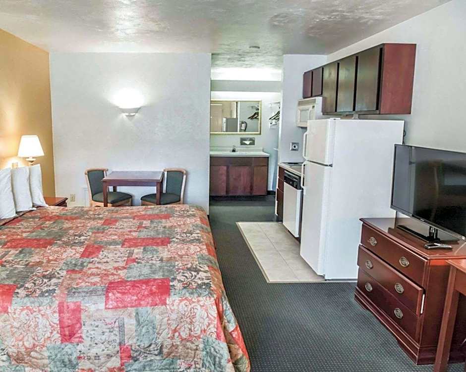 The hotel offers a variety of room types, including efficiency rooms with either 2 double beds, 2 queen beds, or 1 queen bed. There are also suites with 1 queen bed, 1 king bed, or a combination of both, accommodating up to 2 adults and 1 child. Smoking is not allowed in any of the rooms. Bed sizes include queen and king, and the rooms accommodate up to 2 adults and 1 child.