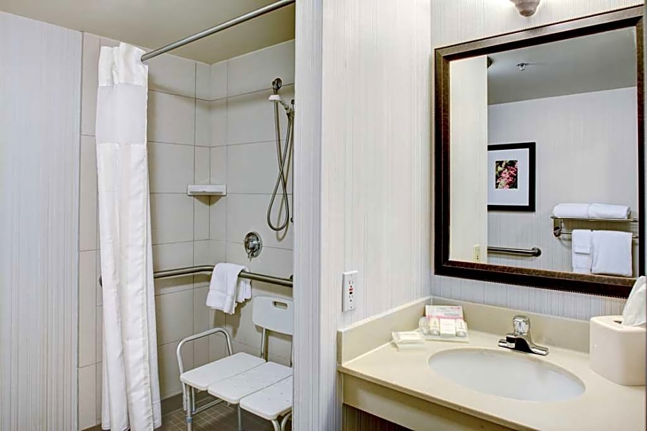 Mobility room with accessible tub, free WiFi, desk and ergonomic chair, armchair with ottoman, 32-inch HDTV. This mobility accessible standard room features one king-sized bed, and an accessible tub. This room offers the latest in technology and ergonomic comfort to our guests. Grab bar in tub with attached accessible seating, lowered vanity in bathroom, and lowered shelf in closet. The pursuit of the perfect night's stay continues with new amenities including the bed, chair, television and crisp white duvet. Enjoy an in-room movie or your favorite television show on our 36-inch HDTV. There's also a microwave, refrigerator and coffee/tea maker to help you feel at home. And for conducting business, our rooms ensure your productivity thanks to the spacious work desk, two telephones with dataport and voicemail and complimentary wired and wireless internet access. Any corresponding photo may not reflect the specific accessible room type or room feature.