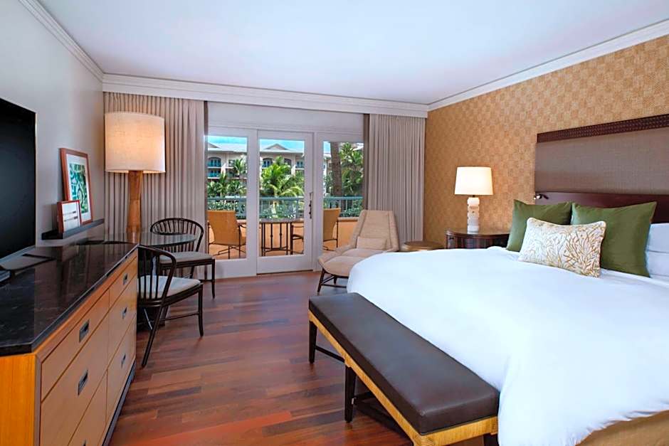 This room offers views of the Pacific Ocean from your patio or lanai, and includes a separate living area with pull-out sofa bed, a TV with cable channels, an electronics charging station, a DVD player, a coffee machine, and Hawaiian inspired artwork. Bathrobes and slippers are provided. A marble private bathroom with deep soaking bathtub, separate shower and premium toiletries is also provided.
