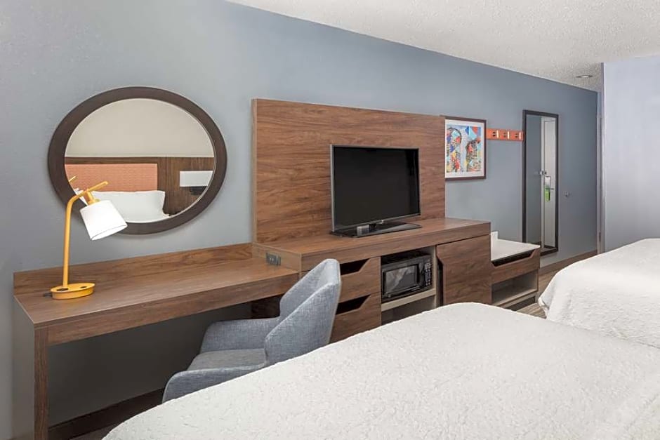 32-inch LCD TV, work desk, microwave, refrigerator, coffeemaker, free WiFi access Enjoy a restful stay in this comfortable room with two queen-sized clean and fresh Hampton beds®, a comfortable easy chair and a 32-inch TV with HD channels. This room also features a large work desk, a microwave, mini-refrigerator and a coffeemaker. Free WiFi access will help you to stay connected when on the road. The bathroom contains plush towels and a shower featuring a curved shower rod for added space and light.