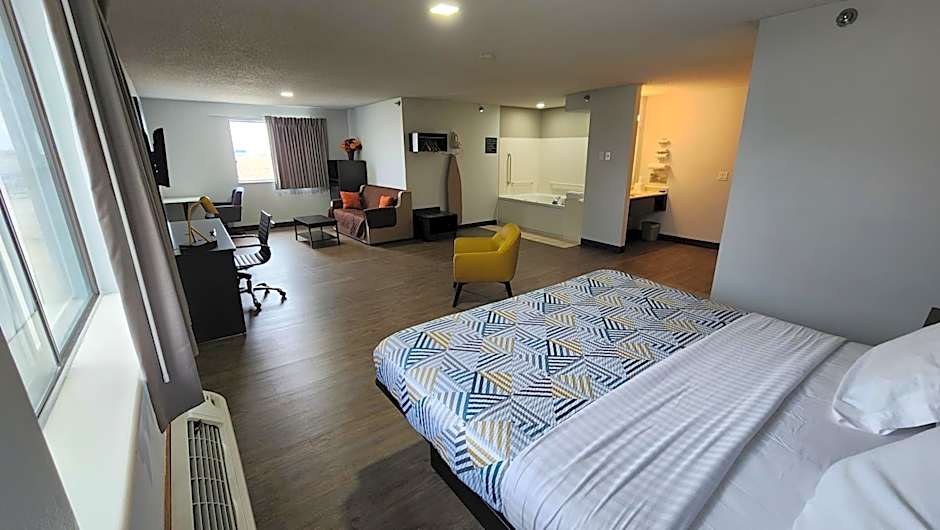 The Motel 6 in Kewanee, IL offers a variety of room types including Queen Rooms, Suites, Deluxe Queen Rooms, Deluxe King Rooms, Deluxe Quadruple Rooms, and King Suites with a spa bath. All rooms are non-smoking and have a room size of 205 sqft. The occupancy for most rooms is 2 adults and 1 child, with the exception of the Deluxe Quadruple Room which accommodates 4 adults and 3 children. Bed sizes range from queen to king, with some rooms having double beds.