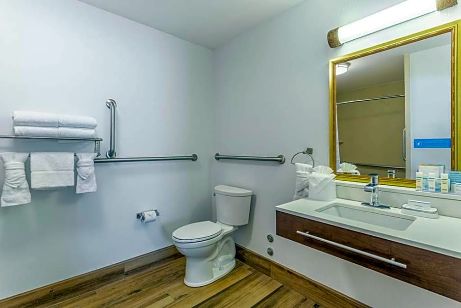 This mobility and hearing accessible, non-smoking suite features one king-sized bed, and an accessible roll-in shower. The suite also has a visual alarm and notification devices for the doorbell or door knock and incoming phone calls. The room features include a microwave, refrigerator, comfortable soft seating, a HDTV, and easy to operate alarm clock/radio. The free WiFi will help you stay connected while on the road. You'll also enjoy the convenience of having a coffeemaker with tea service and iron/ironing board in your room. Any corresponding photo may not reflect the specific accessible room type or room feature.
