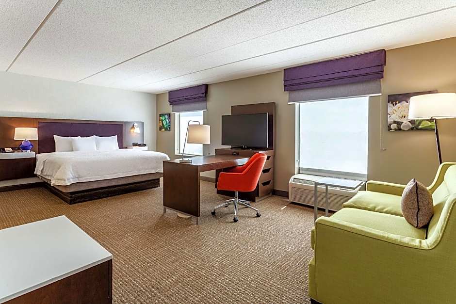 Work area, free WiFi, 32-inch TV, tea/coffeemaker, easy chair with ottoman Have a relaxing stay in this king room that features our clean and fresh Hampton bed®. Unwind in the easy chair with ottoman while watching your favorite show on the 32-inch TV. Enjoy a delicious hot drink from the in-room tea/coffeemaker. The room includes a spacious desk and free WiFi to let you catch up on work while traveling. In the bathroom you'll enjoy fluffy towels, a WaterPik showerhead and curved shower rod for added space and light.