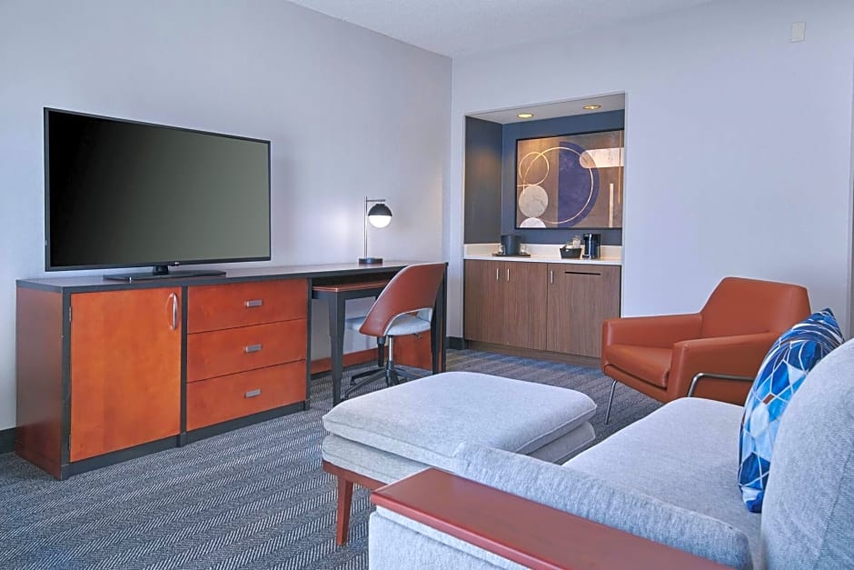 The Courtyard Chicago Lincolnshire hotel offers a Suite with 1 King bed and a sofa bed, accommodating up to 5 adults and 4 children. There is also a King Room with a Sofa Bed, accommodating up to 4 adults and 3 children, and a Queen Room with Two Queen Beds, also accommodating up to 4 adults and 3 children. All rooms are non-smoking and have varying sizes between 355 sqft and 431 sqft.