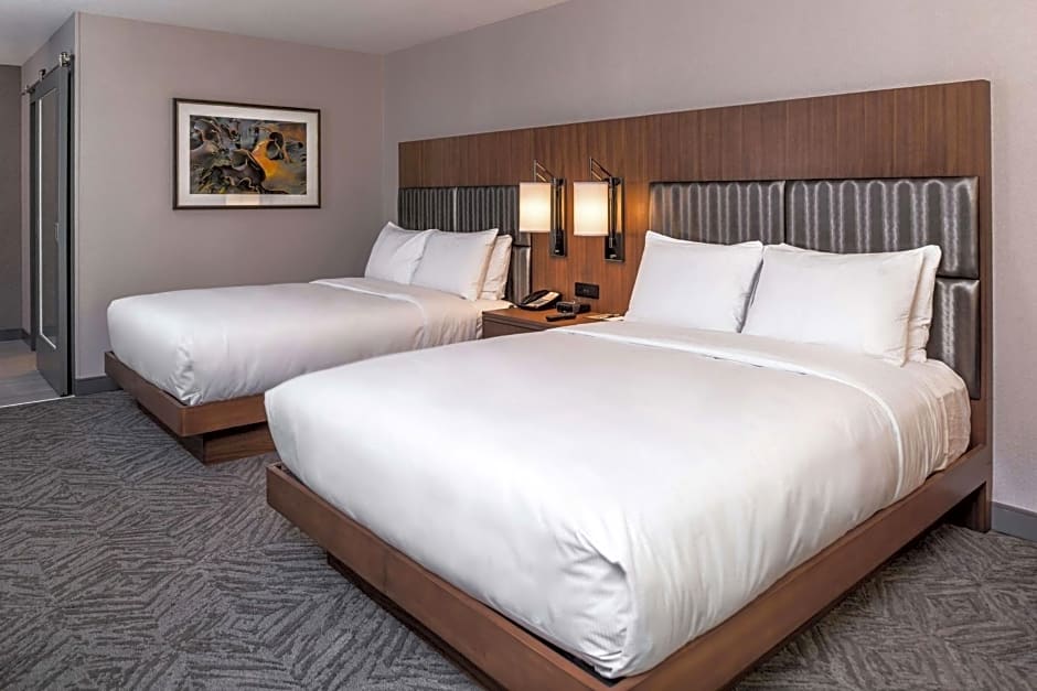 The Doubletree By Hilton Lafayette East offers a variety of room types including suites, quadruples, and doubles. The suites and quadruples have a room size of 366 sqft, while the king corner suite is slightly larger at 452 sqft. All rooms do not allow smoking. The accommodations range from 2 adults and 1 child to 4 adults and 3 children. The bed sizes vary from 1 king size bed to 2 queen size beds, with some rooms also featuring a sofa bed.