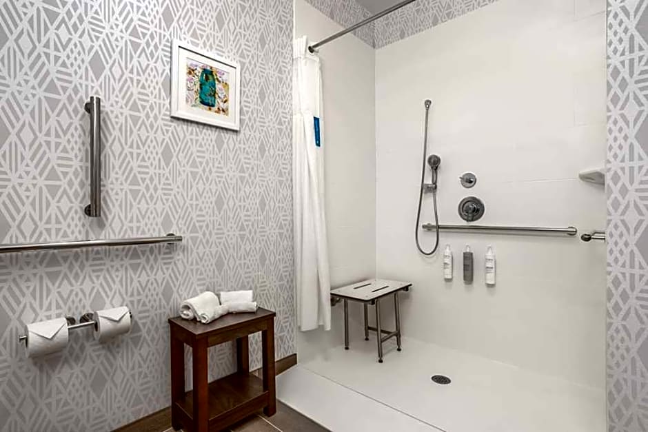 This mobility and hearing accessible, one-room, non-smoking studio suite features one king-sized bed, and an accessible roll-in shower. The suite also has a visual alarm and notification devices for the doorbell or door knock and incoming phone calls. The room features include a microwave, refrigerator, wet bar, comfortable soft seating, a 37-inch HDTV, and easy to operate alarm clock/radio. The free high-speed internet access will help you stay connected while on the road. If you prefer not to work at the desk, you can use the convenient lapdesk instead. You'll also enjoy the convenience of having a coffeemaker with tea service and iron/ironing board in your room. Any corresponding photo may not reflect the specific accessible room type or room feature.