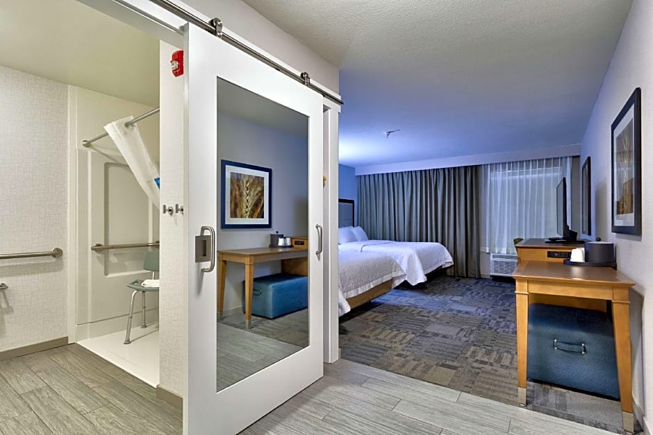 This mobility accessible, non-smoking room features one king-sized bed, and an accessible roll-in shower. The room features comfortable soft seating, a HDTV, refrigerator and microwave, and easy to operate alarm clock/radio. The free high-speed internet access will help you stay connected while on the road. If you prefer not to work at the desk, you can use the convenient lapdesk instead. You'll also enjoy the convenience of having a coffeemaker with tea service and iron/ironing board in your room. Any corresponding photo may not reflect the specific accessible room type or room feature.