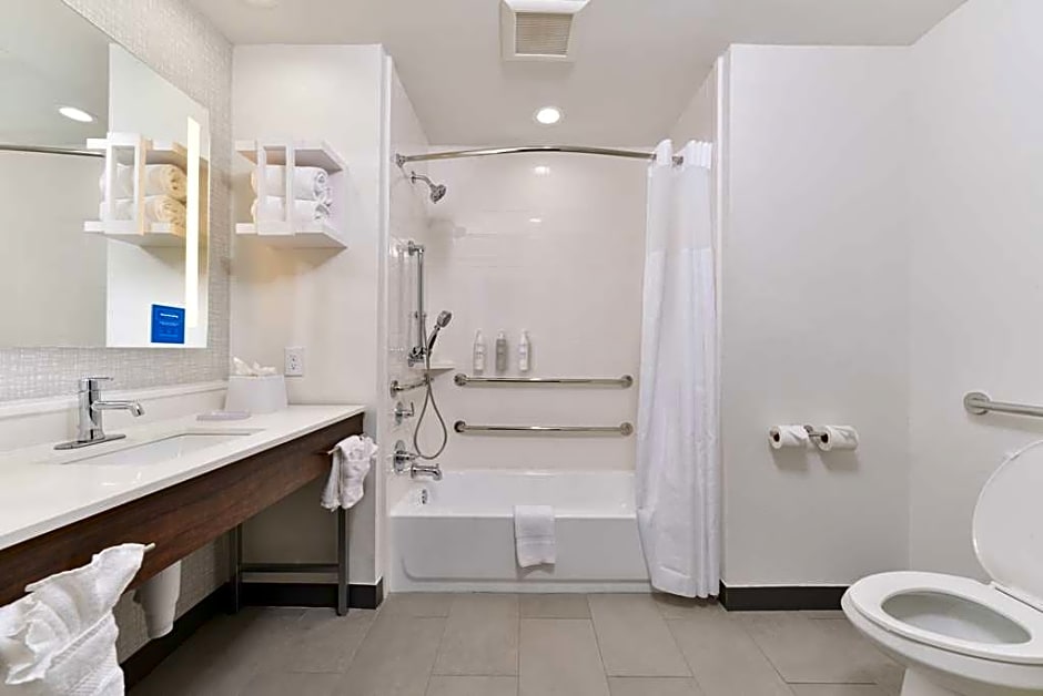 This mobility accessible, one-room, non-smoking studio suite features one king-sized bed, and an accessible bath tub. The suite features include a sofa bed, microwave, refrigerator, comfortable soft seating, a HDTV, and easy to operate alarm clock/radio. The free high-speed internet access will help you stay connected while on the road. If you prefer not to work at the desk, you can use the convenient lapdesk instead. You'll also enjoy the convenience of having a coffeemaker with tea service and iron/ironing board in your room. Any corresponding photo may not reflect the specific accessible room type or room feature.