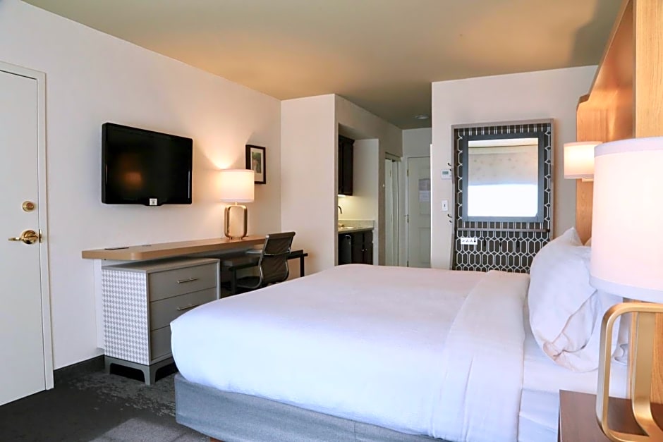 Besides offering free high speed wireless internet access this spacious suite also includes a living area with a sleeper sofa. Other great perks include a dining table that can seat two as well as a separate bedroom. You can make a snack with a microwave a stove top and a mini fridge.