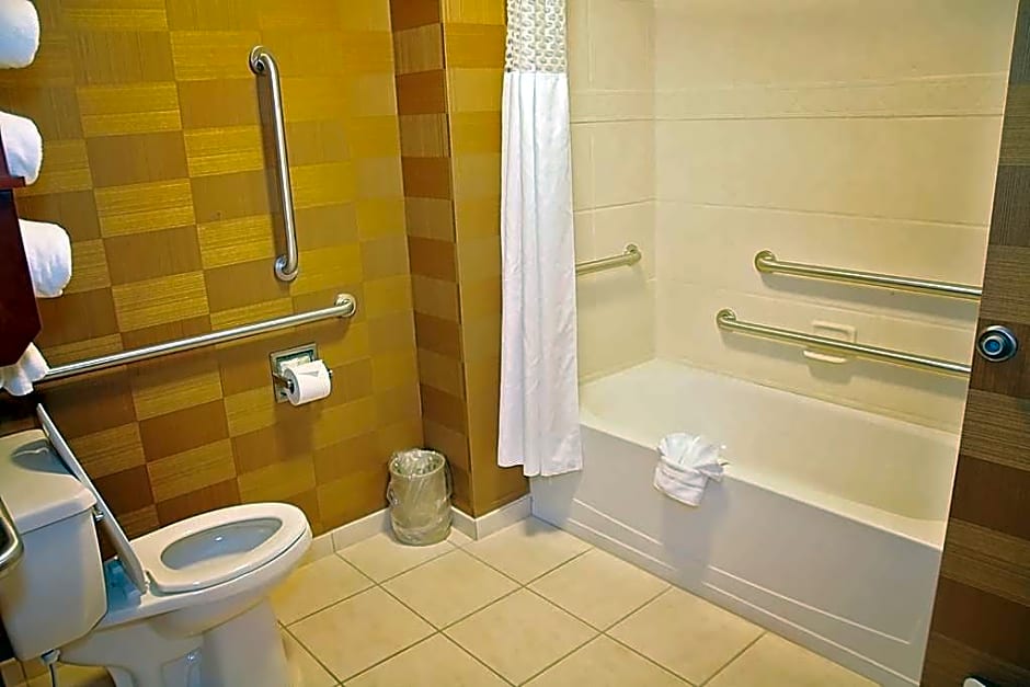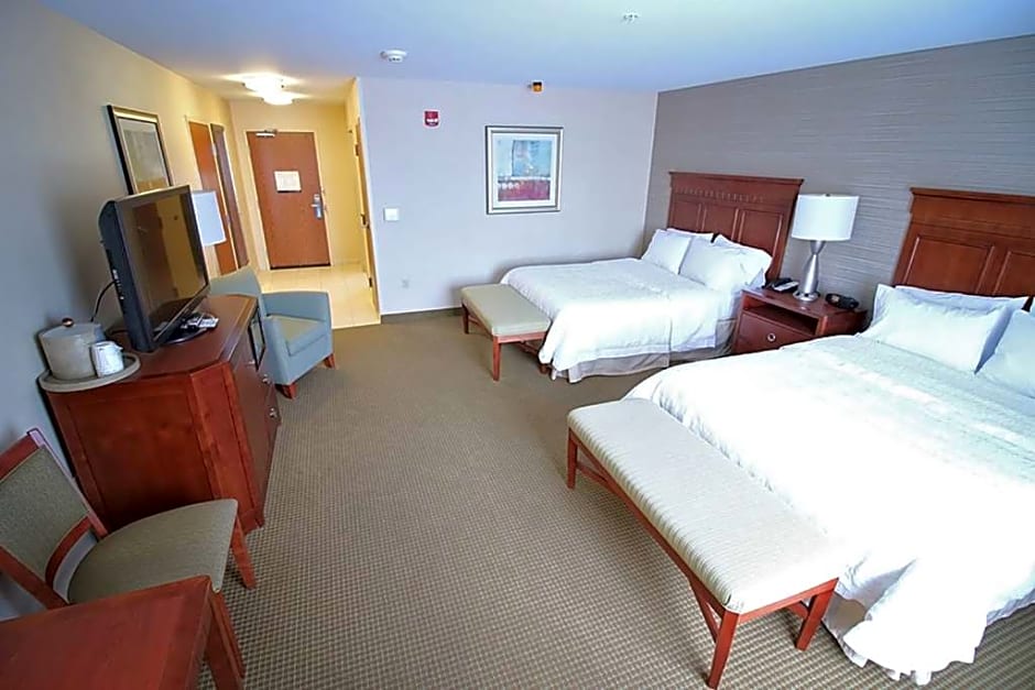 This mobility and hearing accessible, non-smoking studio suite features two fresh Hampton queen-sized beds, and an accessible tub. Also included is a 42" HDTV, and easy to operate alarm clock/radio. The free high-speed internet access will help you stay connected while on the road. If you prefer not to work at the desk, you can use the convenient lapdesk instead. You'll also enjoy the convenience of having a coffeemaker with tea service and iron/ironing board in your room. In the bathroom you will enjoy our large dressing area with fluffy towels, WaterPik showerhead and curved shower rod that allows more light and space in the shower. Any corresponding photo may not reflect the specific accessible room type or room feature.