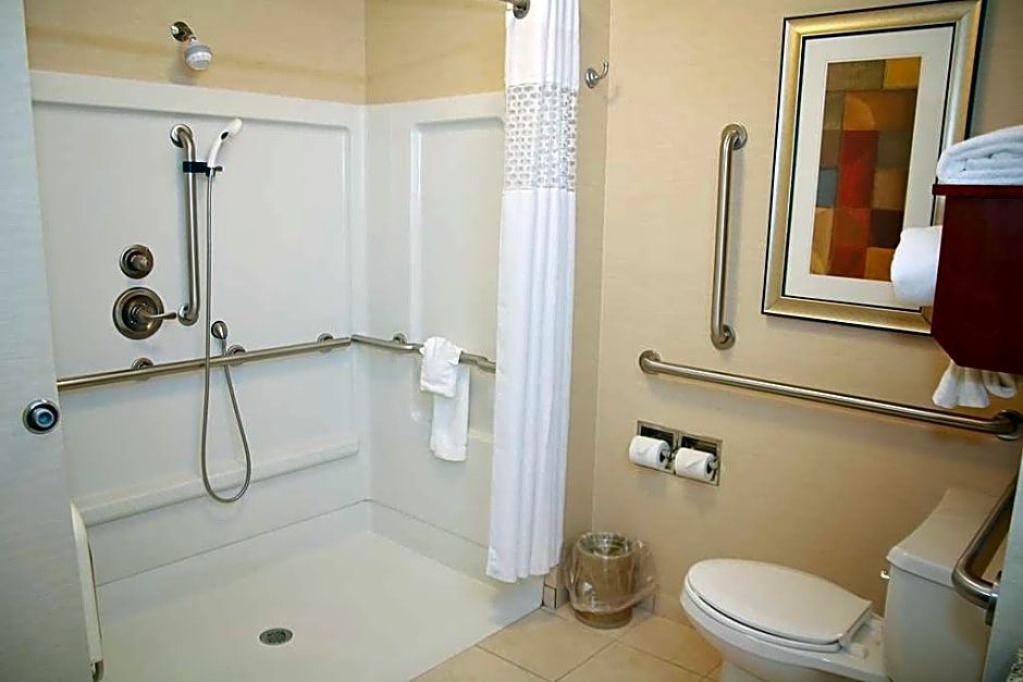 This mobility and hearing accessible, non-smoking room features one fresh Hampton king-sized bed , and an accessible roll-in shower. Also included is a sofabed, 42" HDTV, and easy to operate alarm clock/radio. The free high-speed internet access will help you stay connected while on the road. If you prefer not to work at the desk, you can use the convenient lapdesk instead. You'll also enjoy the convenience of having a coffeemaker with tea service and iron/ironing board in your room. In the bathroom you will enjoy our large dressing area with fluffy towels, and WaterPik showerhead. Any corresponding photo may not reflect the specific accessible room type or room feature.