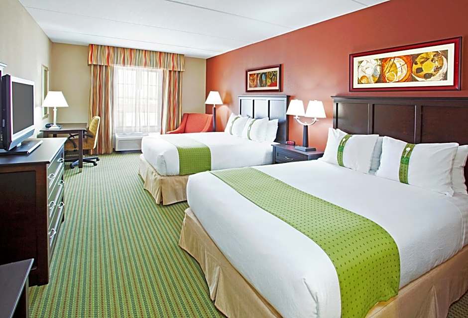 The Holiday Inn Midland offers a variety of room options including Queen Rooms with Two Queen Beds, King Rooms, Deluxe King Rooms, Queen Rooms with Three Queen Beds, Standard Rooms, and Deluxe Queen Rooms with Two Queen Beds. All rooms are non-smoking and have a room size of 323 sqft. Occupancy ranges from 2 adults and 1 child to 6 adults and 4 children depending on the room type, and bed sizes include either 2 Queen beds, 1 King bed, or a combination of both.
