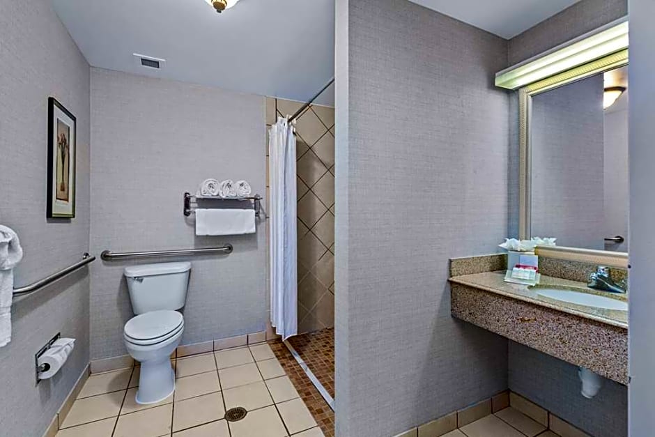 This mobility and hearing accessible standard room features two queen-sized beds, and a 3x3 transfer shower. The room also has a visual alarm, and notification devices for the doorbell or door knock and incoming telephone calls. Relax in a warm and welcoming accessible guest room with a 3x3 transfer shower with a built-in fold down seat with grab bars, plus a shower head that can be used as a handheld or fixed shower. Lowered vanity in bathroom, and lowered shelf in closet. The ergonomic Mirra chair by Herman Miller is good for your back and better for work. Enjoy an in-room movie or your favorite T.V show on our 36-inch HDTV. There is also a microwave, refrigerator and coffee maker to help you feel at home. And for conducting business, our rooms offer a spacious work desk, two telephones with dataport and voicemail and complimentary wired and wireless WiFi access. Any corresponding photo may not reflect the specific accessible room type or room feature.