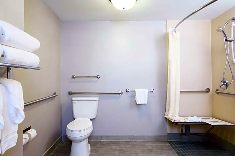 This mobility accessible standard room features one king-sized bed, and a roll-in shower. This room offers the latest in technology and ergonomic comfort to our guests. Roll-in shower with attached accessible seating, lowered vanity in bathroom, and lowered shelf in closet. The ergonomic Mirra chair by Herman Miller is good for your back and better for work. Enjoy an in-room movie or your favorite television show on our 36-inch HDTV. There's also a microwave, refrigerator and coffee/tea maker to help you feel at home. And for conducting business, our rooms ensure your productivity thanks to the spacious work desk, two telephones and complimentary wired and WiFi access. Any corresponding photo may not reflect the specific accessible room type or room feature.