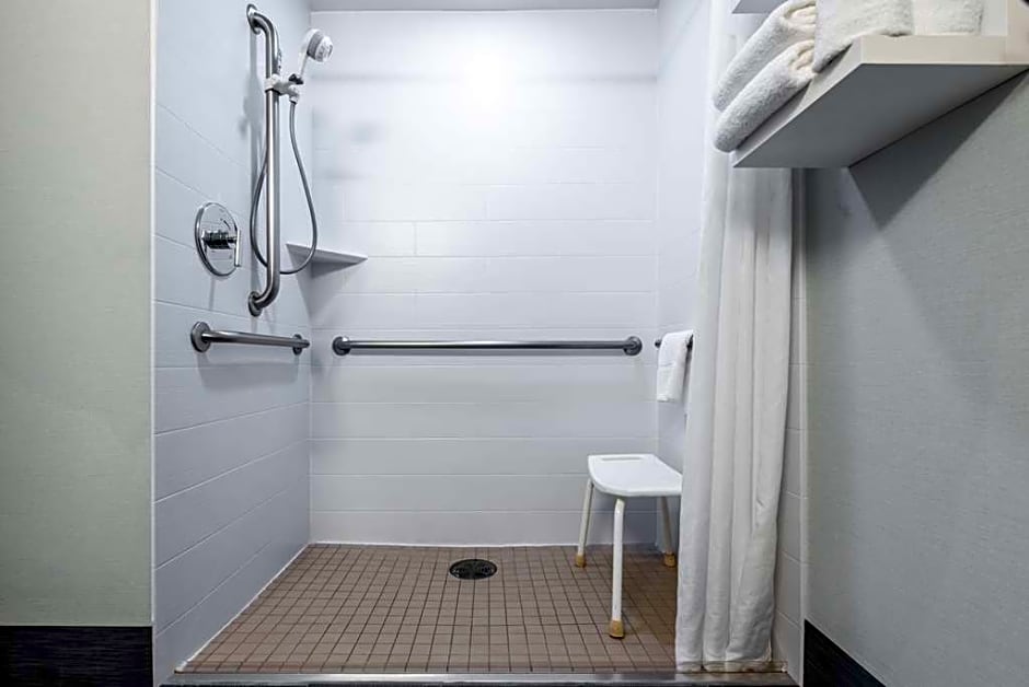 This mobility accessible, non-smoking room features one king-sized bed, and an accessible roll-in shower. The room features comfortable soft seating, microwave, refrigerator, a HDTV, and easy to operate alarm clock/radio. The free Wi-Fi access will help you stay connected while on the road. If you prefer not to work at the desk, you can use the convenient lapdesk instead. You'll also enjoy the convenience of having a coffeemaker with tea service and iron/ironing board in your room. Any corresponding photo may not reflect the specific accessible room type or room feature.