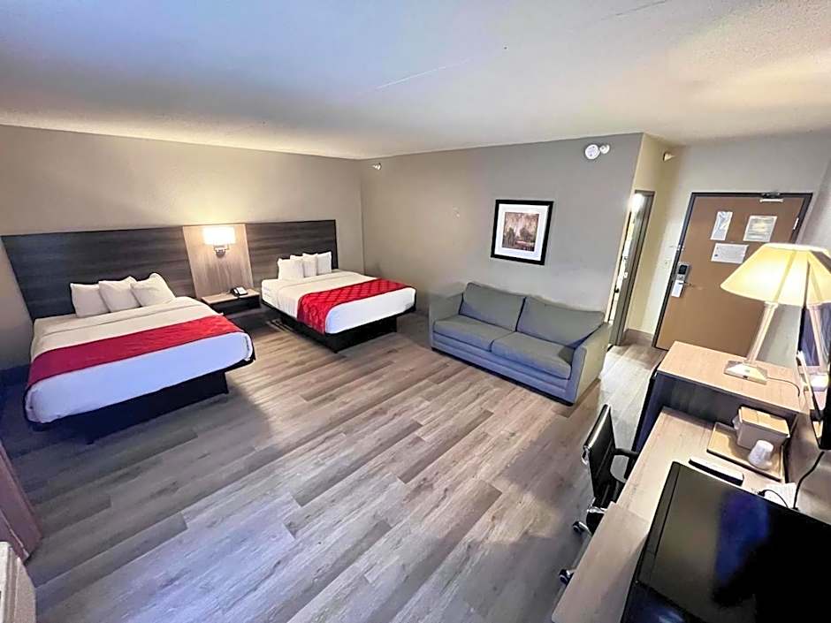 The Ramada by Wyndham Platte City KCI Airport offers a variety of rooms including 1 King Bed Studio Suites, 1 King Bed One-Bedroom Business Rooms, 1 Queen Bed Accessible Rooms, 2 Queen Beds, 1 King Bed rooms, 1 King Bed One-Bedroom Suites, and 2 Queen Beds Studio Suites. All rooms are non-smoking and have different occupancy capacities ranging from triple to quadruple, accommodating both adults and children. The bed sizes range from King to Queen, with some rooms also offering sofa beds.