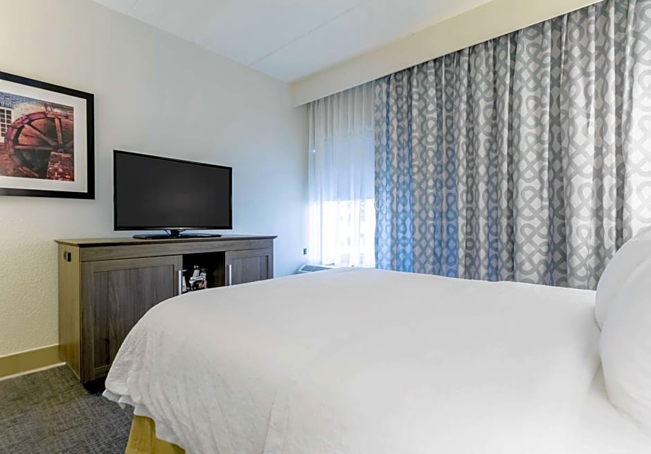This hearing accessible, non-smoking room features one king-sized bed. The room also has a visual alarm and notification devices for the doorbell or door knock and incoming phone calls. The room features our luxurious clean and fresh Hampton bed, comfortable soft seating, a HDTV, and easy to operate alarm clock/radio. In the bath you will enjoy a WaterPik showerhead and curved shower rod. The free WiFi access will help you stay connected while on the road. If you prefer not to work at the desk, you can use the convenient lapdesk instead. You'll also enjoy the convenience of having a coffeemaker with tea service and iron/ironing board in your room. Any corresponding photo may not reflect the specific accessible room type or room feature.