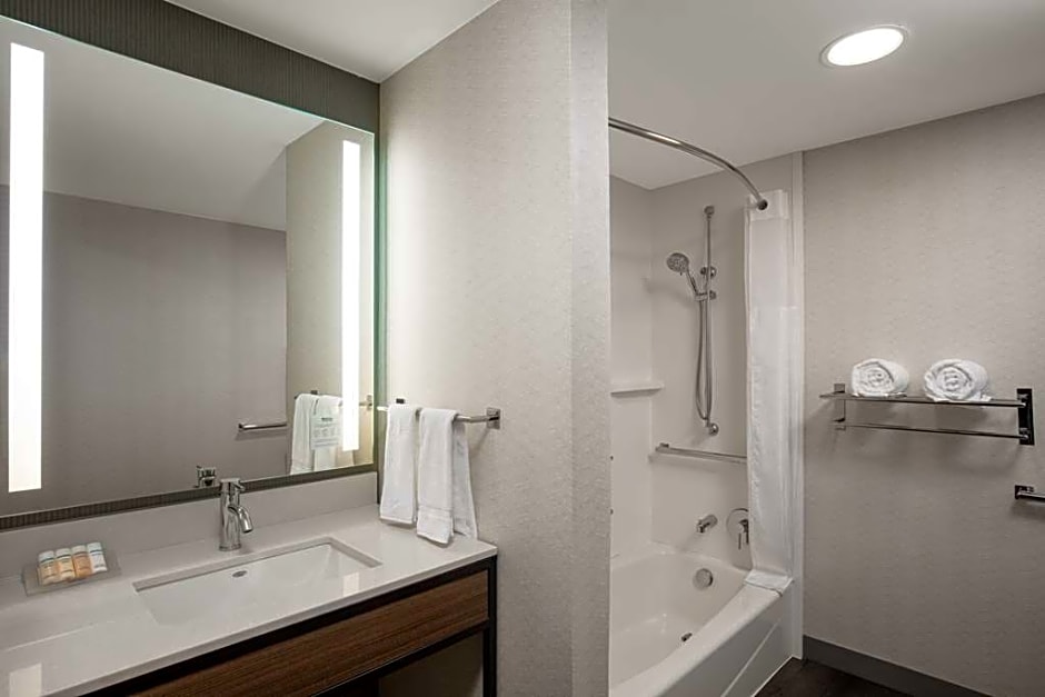 This mobility and hearing accessible standard room features two queen-sized beds, and an accessible tub. The room also has a visual alarm, and notification devices for the doorbell or door knock and incoming telephone calls. Grab bar in tub with attached accessible seating, lowered vanity in bathroom, and lowered closet shelf. And the pursuit of the perfect night's stay continues with new amenities including the bed, chair, and television. The ergonomic Mirra chair by Herman Miller is good for your back and better for work. Enjoy your favorite television show on our 36-inch HDTV. There's also a microwave, refrigerator and coffee/tea maker to help you feel at home. And for conducting business, our rooms ensure your productivity thanks to the spacious work desk, two telephones with voicemail and data ports, complimentary HBO and local newspaper each weekday morning. Any corresponding photo may not reflect the specific accessible room type or room feature.