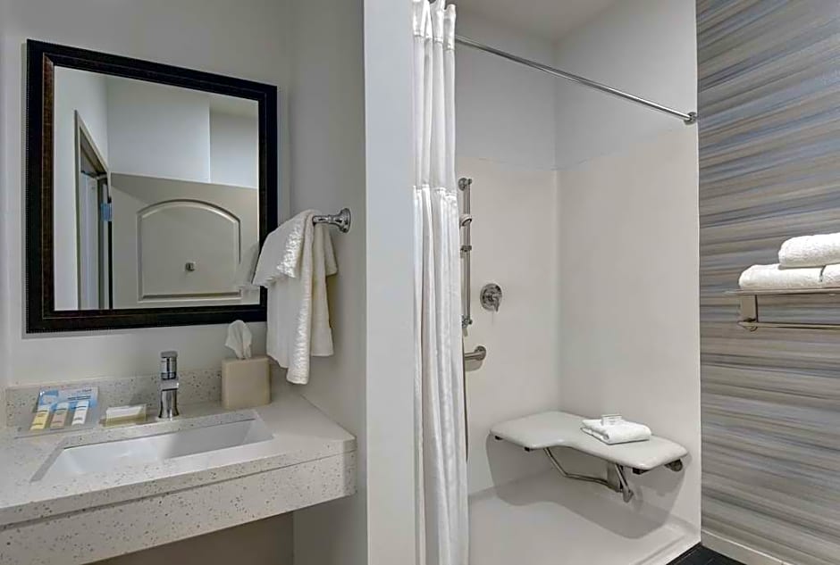 2 queen-sized beds, separate living room, sofa bed, roll-in shower, free WiFi This mobility accessible one bedroom suite features two queen-sized beds. Bath tub shower with attached accessible seating, lowered vanity in bathroom, and lowered closet shelf. The ergonomic chair is good for your back and better for work. Enjoy your favorite television show on our 36-inch HDTV. There's also a microwave, refrigerator and coffee/tea maker to help you feel at home. A separate living area with a full-sized sofa bed, coffee table and TV. Additional features include microwave, fridge, work desk, coffeemaker and two telephones. Any corresponding photo may not reflect the specific accessible room type or room feature.
