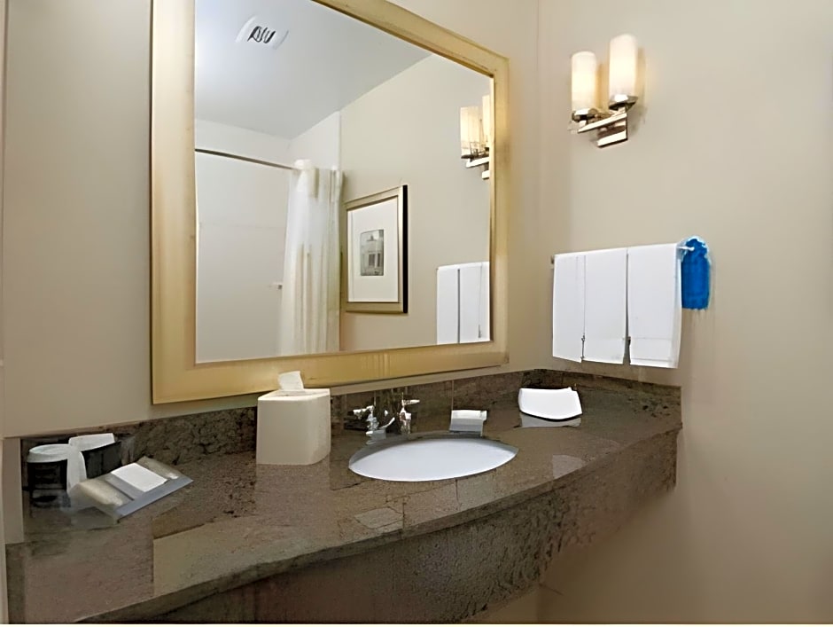 This mobility and hearing accessible standard one bedroom suite features one king-sized bed, and a 3x3 transfer shower. The room also has a visual alarm, and notification devices for the doorbell or door knock and incoming telephone calls. A 3x3 transfer shower with a built-in fold down seat with grab bars, plus a shower head that can be used as a handheld or fixed shower. Lowered vanity in bathroom, and lowered shelf in closet. The ergonomic Mirra chair by Herman Miller is good for your back and better for work. Enjoy your favorite TV show on our 36-inch HDTV. There is also a microwave, refrigerator and coffeemaker to help you feel at home. A separate living area with a full-sized sofa bed, coffee table and TV. For conducting business, our rooms offer a spacious work desk, two telephones with dataport and voice mail and complimentary WiFi access. Any corresponding photo may not reflect the specific accessible room type or room feature.