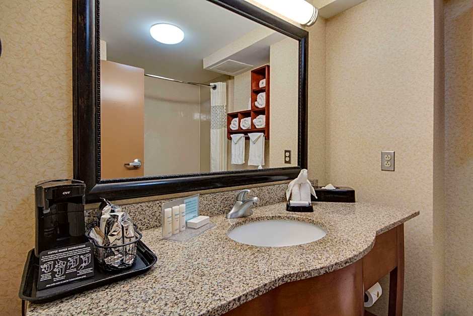 32-inch LCD HDTV, work desk, coffeemaker, free WiFi, refrigerator, microwave Experience a restful stay in this comfortable room with a clean and fresh Hampton bed®. Watch your favorite TV shows on the 32-inch LCD TV with HBO and HD channels. This room features a large work desk, an ergonomic chair and free WiFi to help you catch up on work while on the road. The bathroom contains plush towels and a shower with a curved shower rod, offering more space and light. Enjoy the convenience of a microwave, a coffeemaker and a refrigerator in this room.