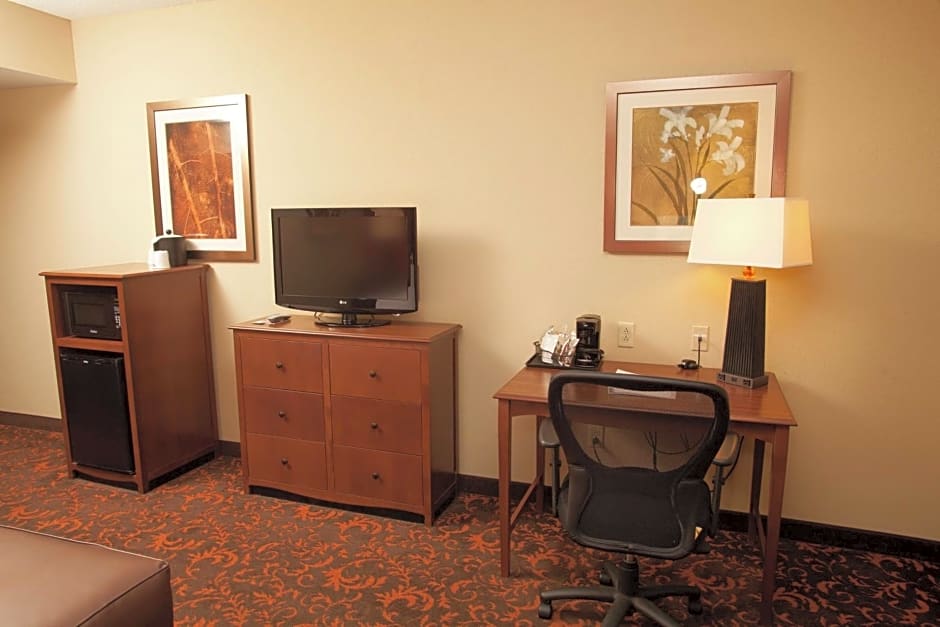 This mobility and hearing accessible, non-smoking room features one king-sized bed, and an accessible roll-in shower. The room also has a visual alarm and notification devices for the doorbell or door knock and incoming phone calls. The room features comfortable lounge chair, microwave, refrigerator, a HDTV, and easy to operate alarm clock/radio. The free WiFi access will help you stay connected while on the road. If you prefer not to work at the desk, you can use the convenient lapdesk instead. You'll also enjoy the convenience of having a coffeemaker with tea service and iron/ironing board in your room. Any corresponding photo may not reflect the specific accessible room type or room feature.