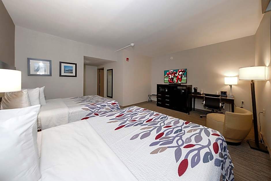 The Red Roof Inn & Suites Newburgh - Stewart Airport offers a variety of room types. These include suites with 2 queen beds and a lake view, deluxe queen rooms with two queen beds and a lake view, deluxe king rooms, and superior king rooms. All rooms are non-smoking and have different capacities for adults and children. The bed sizes range from queen to king.