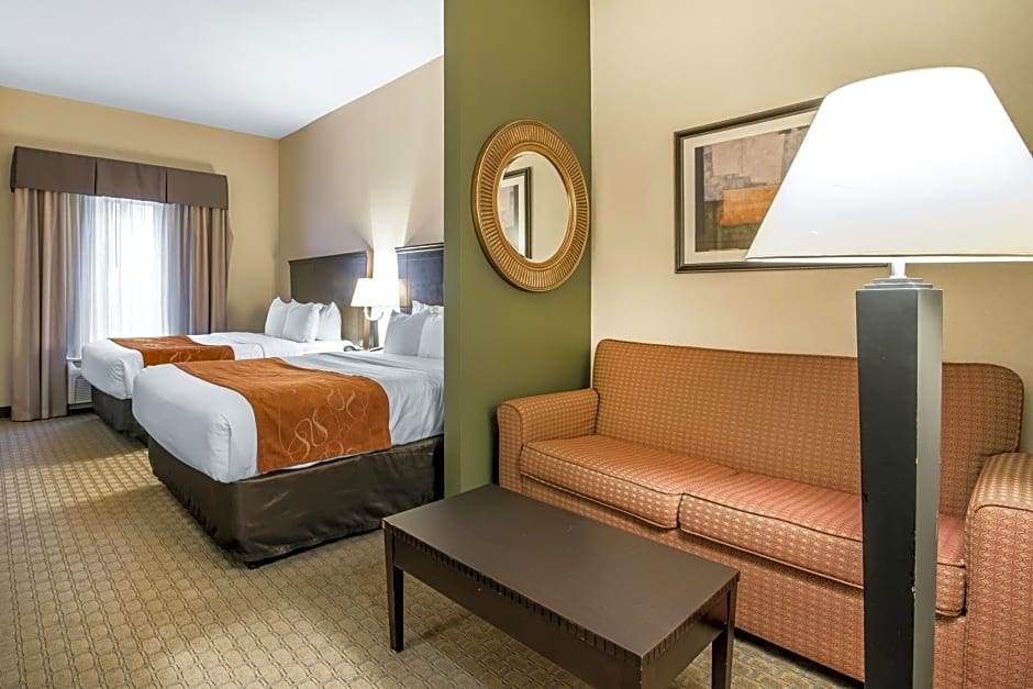 2 Queen Beds is 269 square feet and includes 2 queen-size beds 150-154 width plus desk, satellite tv , cable tv, and hairdryer.