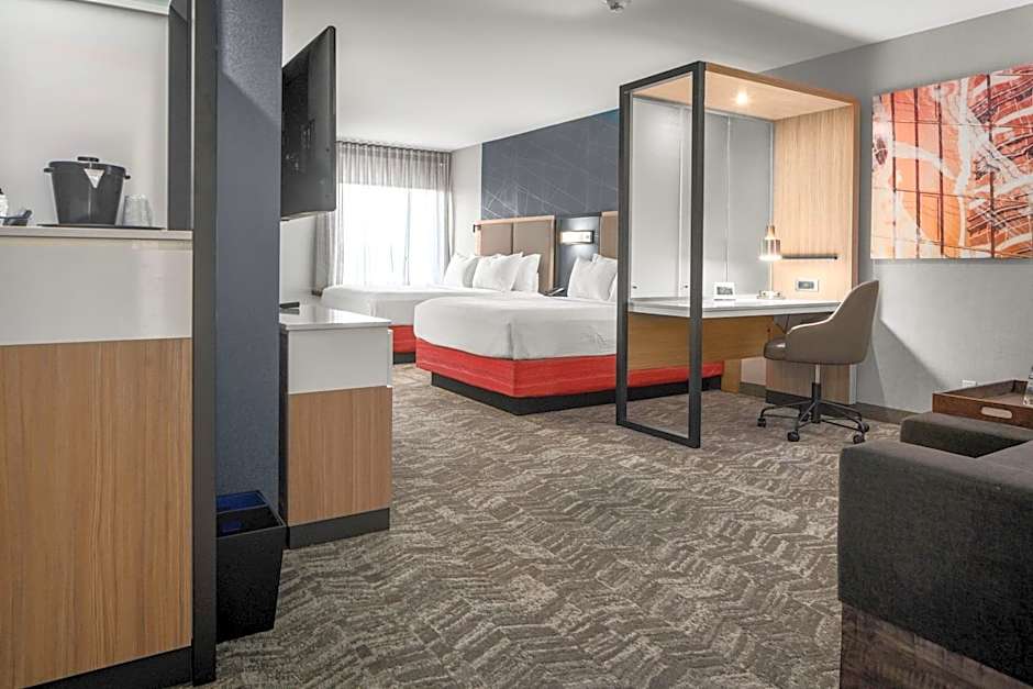The SpringHill Suites by Marriott Raleigh Apex offers two types of suites. The King Suite with Trundle Bed has a room size of 355 sqft and accommodates 4 adults with a King size bed. The Suite with Two Queen Trundle Beds has a larger room size of 409 sqft and accommodates 6 adults with two Queen size beds. Smoking is not allowed in either of these rooms.