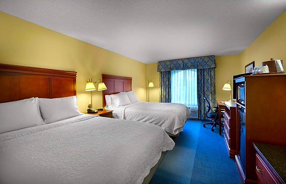 Any corresponding photo may not reflect the specific accessible room type or room feature. This hearing accessible, nonsmoking room features two queen sized bed(s). The room also has a visual alarm and notification devices for the doorbell or door knock and incoming phone calls. The room features our luxurious Clean and Fresh Hampton Bed, comfortable soft seating, microwave, refrigerator, a HDTV, and easy to operate alarm clock/radio. In the bath you will enjoy a WaterPik shower head and curved shower rod. The free high speed internet access will help you stay connected while on the road. If you prefer not to work at the desk, you can use the convenient lapdesk instead. You'll also enjoy the convenience of having a coffee maker with tea service and iron/ironing board in your room.