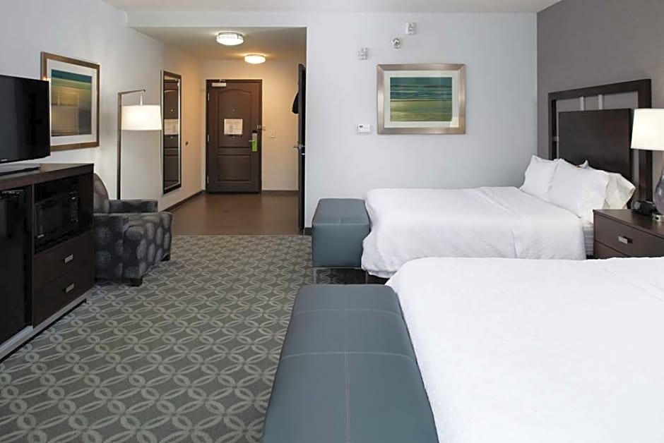 Any corresponding photo may not reflect the specific accessible room type or room feature. This mobility and hearing accessible, nonsmoking room features two queen sized beds and an accessible bathtub. The room also has a visual alarm and notification devices for the doorbell or door knock and incoming phone calls. This spacious nonsmoking room features two queen sized beds with our clean and fresh Hampton beds, comfortable soft seating, 42-inch HDTV and easy to operate alarm clock/radio. The free high-speed internet access will help you stay connected while on the road. If you prefer not to work at the desk, you can use the convenient lapdesk instead. You'll also enjoy the convenience of having a coffee maker with tea service and iron/ironing board in your room. In the bathroom you will enjoy our large dressing area with fluffy towels, WaterPik shower head and curved shower rod that allows more light and space in the shower.