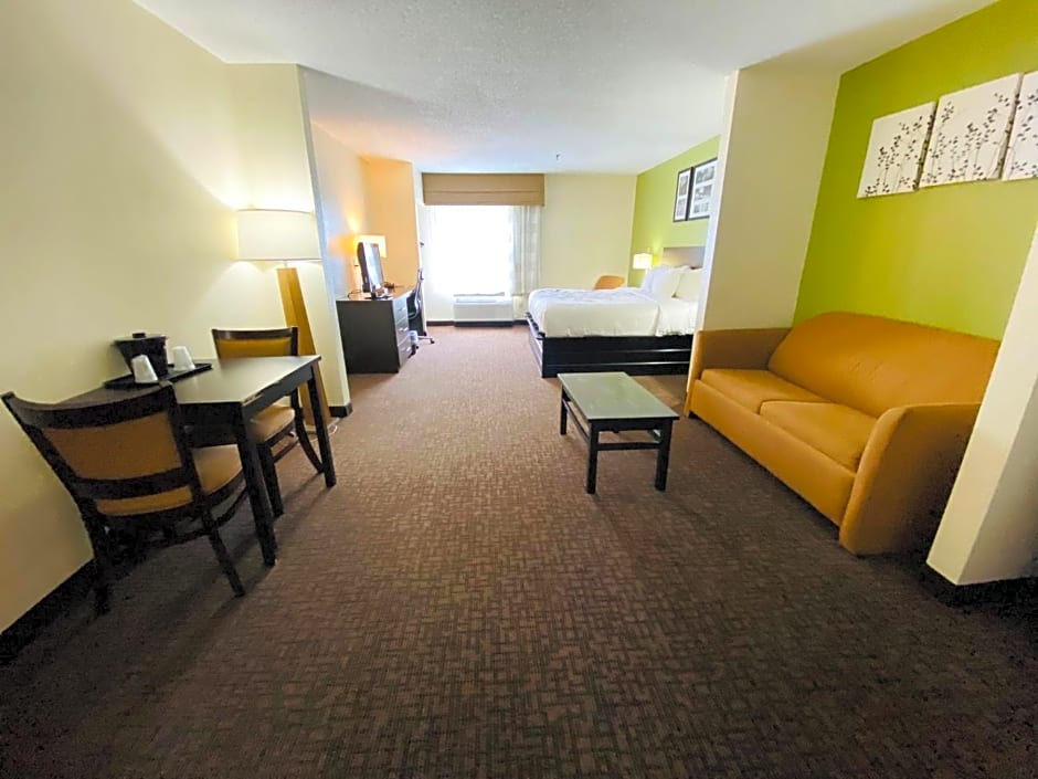 The Sleep Inn & Suites Jacksonville near Camp Lejeune offers various room options. These include double rooms with two double beds, king suites, double rooms, king accessible/non-smoking rooms, king non-smoking rooms, and king suites with whirlpool. Smoking is not allowed in any of the rooms. Room sizes range from 1421 sqft to 2131 sqft. Occupancy varies, accommodating either 2 adults and 1 child or 4 adults and 3 children, depending on the room type.