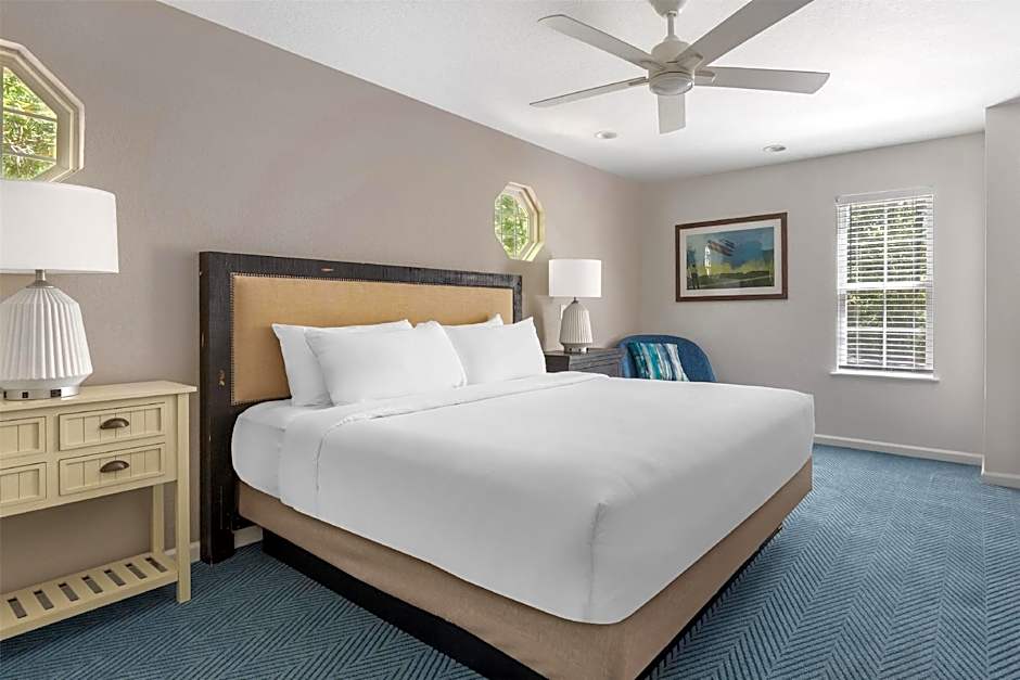 This suite features a plush king sized bed in master bedroom and a loft area with two twin beds. Enjoy a fully-equipped kitchen that provides all of comforts of a home and the convenience to make a meal. The entire family can enjoy this beautiful suite offering a separate living room with a 42’’ HD TV and DVD player. Suite also has a furnished patio. Can accommodate up to 6 guests.